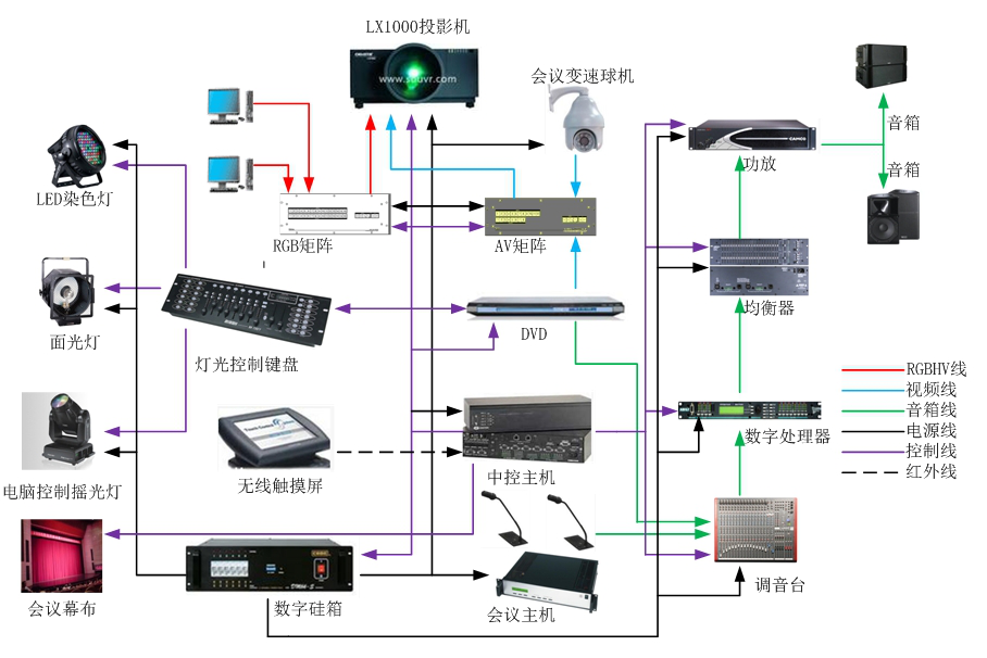 隨著信息時代的到來,計算機多媒體技術(shù)的迅猛發(fā)展,網(wǎng)絡(luò)技術(shù)的普遍應(yīng)用,大到世界各行業(yè)特定政府機關(guān)、國家政法機關(guān)或大型調(diào)度中心的建立,小到各工礦企業(yè)會議、技術(shù)報告及講座的進行,對現(xiàn)代視訊展示、數(shù)碼電聲處理、自動化電器處理等組成的多媒體聲光像系統(tǒng)的渴望越來越強烈,而傳統(tǒng)的模擬電子技術(shù)很難滿足人們在這方面的要求。近幾年迅速崛起多媒體聲光像系統(tǒng)技術(shù)正在逐步成為適應(yīng)這一需求的有效途徑。為此,我們根據(jù)現(xiàn)代會議室的實際應(yīng)用和需求,采用最新的多媒體音視頻產(chǎn)品和先進設(shè)計手段,提出本系統(tǒng)方案供用戶選擇和參考。